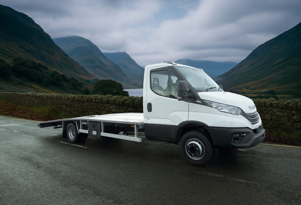 Iveco Daily 7.2t 2025 MY 3.0 180hp HIMATIC Car Transporter in white, built for high capacity vehicle transport with an all aluminium transporter body. Specification includes Rear Air Suspension, Air Conditioning, Cruise Control, DAB Radio, Bluetooth, Apple CarPlay / Android Auto, and Long Range Fuel Tank, along with a professional loading setup and 12,000lb winch.